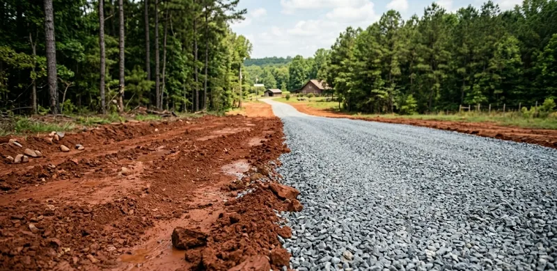 A complete driveway restoration in Toombs County covers three elements: base repair where the crusher run sub-layer has failed, full crown regrading to restore proper drainage across the entire driveway length, and application of fresh #57 crushed stone surface gravel spread to the correct depth. Unlike targeted gravel driveway repair which addresses individual problem sections, restoration treats the full driveway as a single surface — the result is a driveway that drains uniformly, carries traffic evenly, and requires only routine top-dressing maintenance going forward rather than ongoing spot repairs. For driveways where the access route itself needs to be reestablished or regraded from scratch, land grading precedes the restoration work.