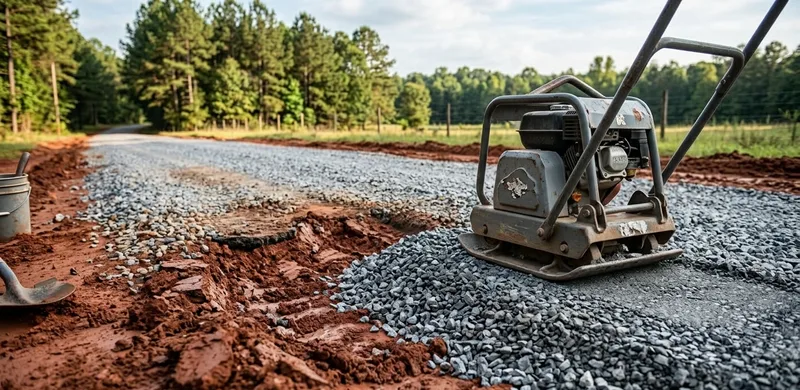 Fixing ruts in a gravel driveway in Toombs County requires addressing the cause, not just filling the grooves. Ruts form when the base has failed or softened — typically from poor drainage, inadequate base depth, or heavy equipment loads on a wet driveway. Proper repair involves removing soft base material, adding compacted crusher run to rebuild the sub-grade, then regrading the surface with fresh stone. Simply adding loose gravel to a rutted surface without fixing the base will result in ruts returning quickly.